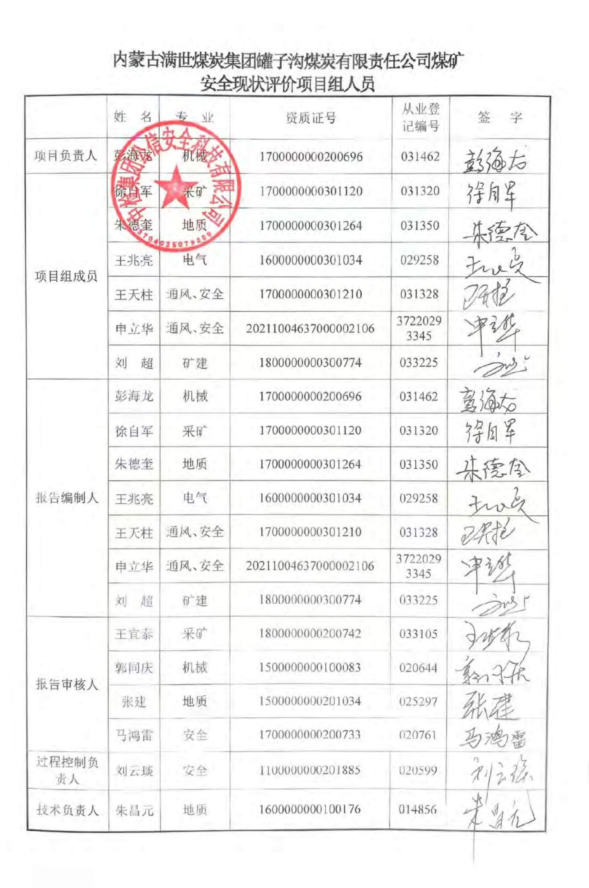 參與安全評(píng)價(jià)工作的注冊(cè)安全工程師: 彭海龍 王天柱 申立華 朱德奎 徐自軍 | |||||||