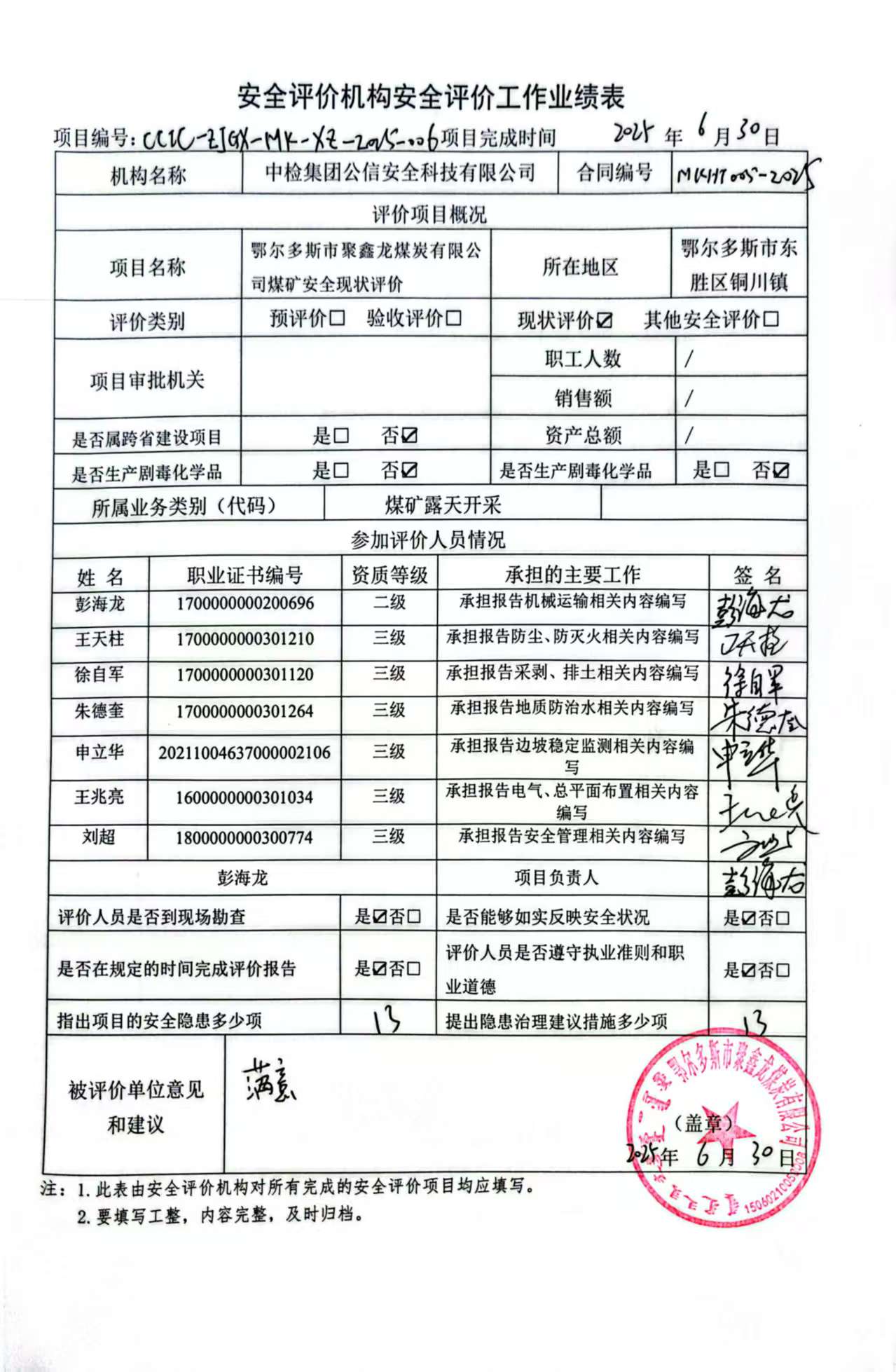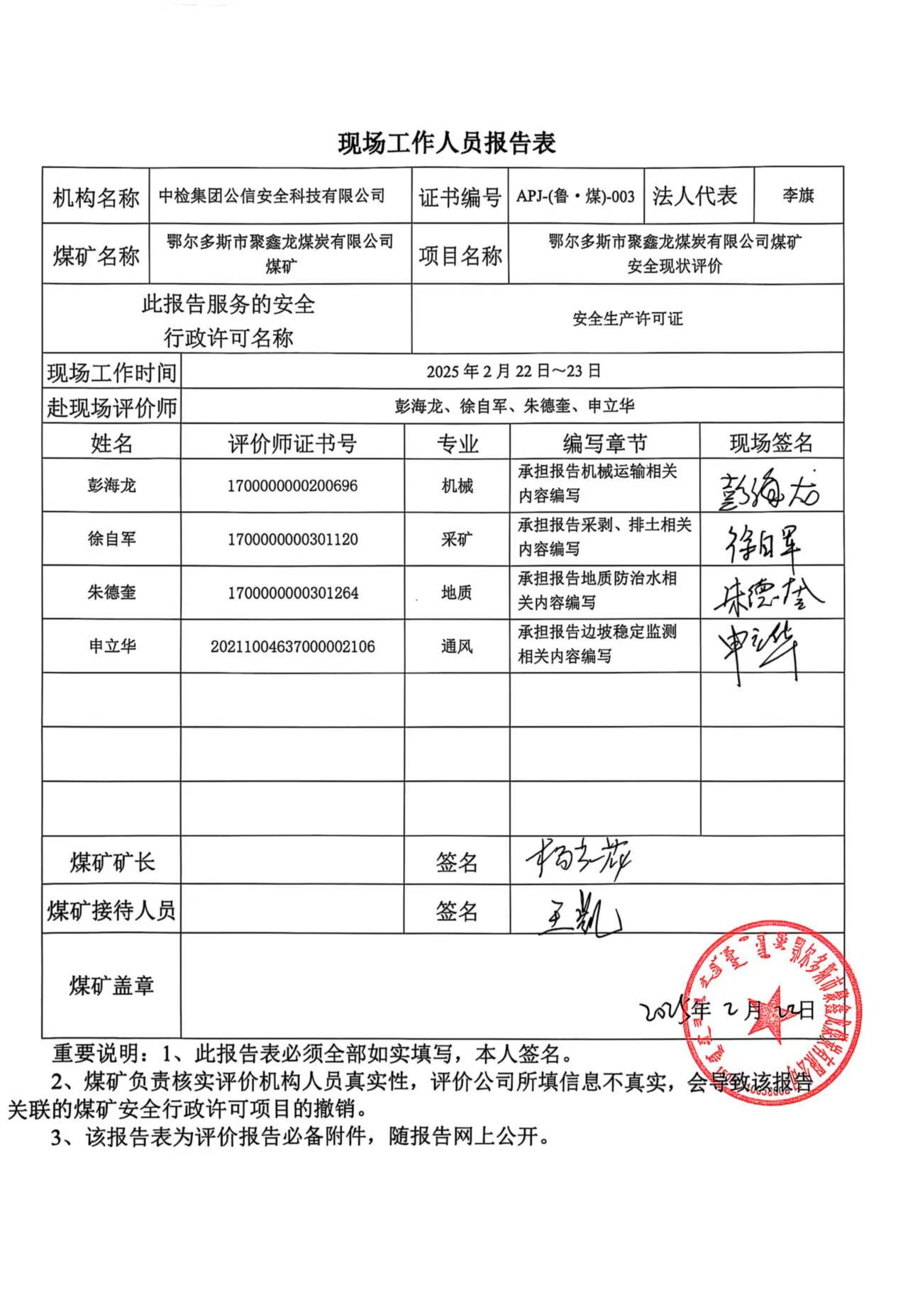 現(xiàn)場(chǎng)開展安全評(píng)價(jià)工作的人員、時(shí)間及主要任務(wù): 彭海龍、徐自軍、朱德奎、申立華于2025年2月22~23日到現(xiàn)場(chǎng)進(jìn)行調(diào)查、收集資料,進(jìn)行現(xiàn)場(chǎng)評(píng)價(jià)。 彭海龍、朱德奎、申立華于2025年6月7日對(duì)現(xiàn)場(chǎng)問題進(jìn)行復(fù)查,礦方均已整改合格。 彭海龍、徐自軍、朱德奎、王兆亮、王天柱、申立華、劉超,對(duì)報(bào)告進(jìn)行了編寫。 | |||||||