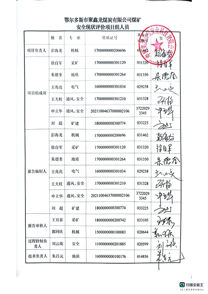 參與安全評(píng)價(jià)工作的注冊(cè)安全工程師: 彭海龍、徐自軍、朱德奎、王天柱、申立華 | |||||||