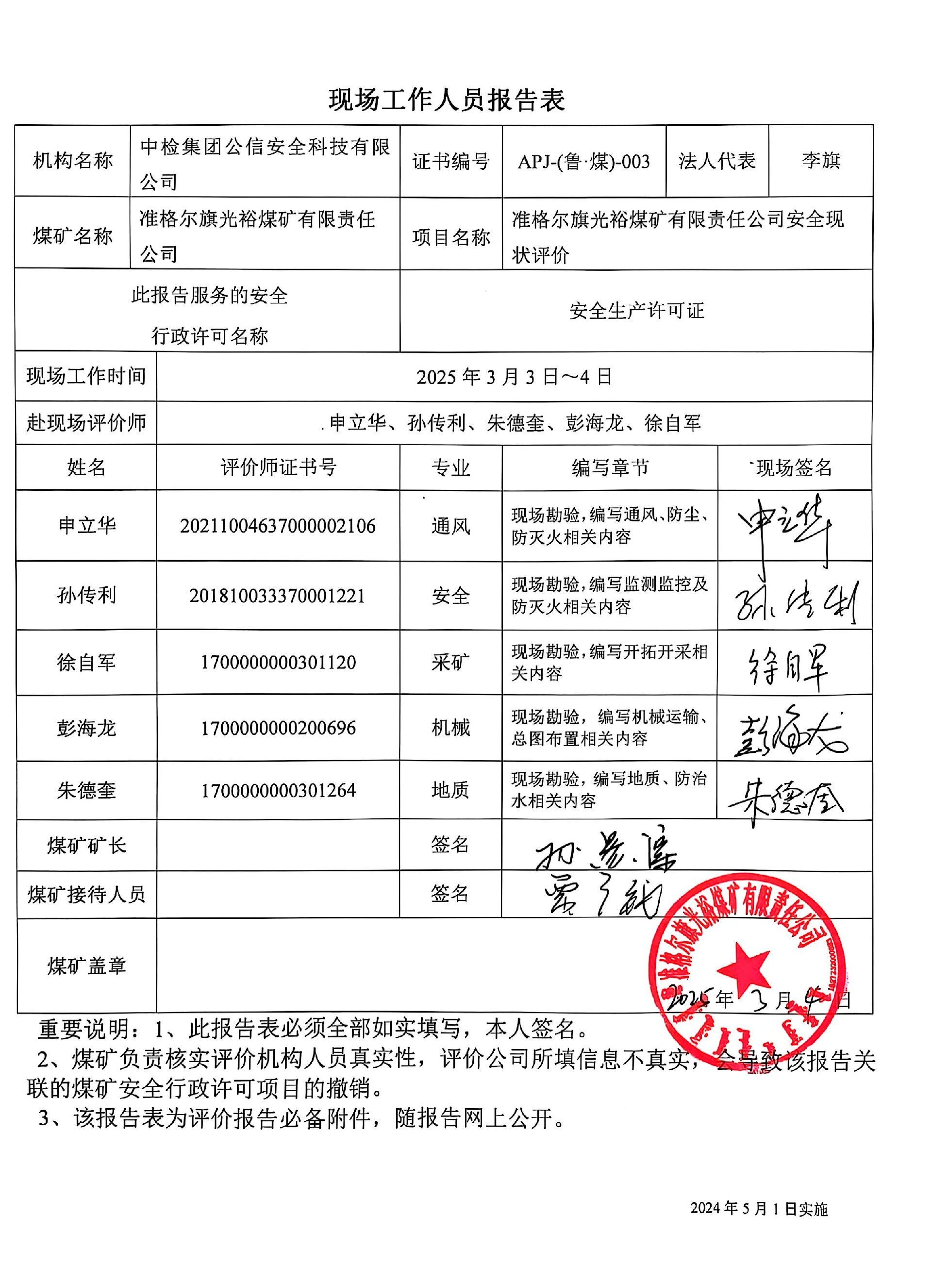 現(xiàn)場開展安全評價(jià)工作的人員、時(shí)間及主要任務(wù): 孫傳利、徐自軍、申立華、朱德奎、彭海龍2025年3月3日~4日到現(xiàn)場進(jìn)行調(diào)查、搜集資料,進(jìn)行現(xiàn)場評價(jià)。 | |||||||