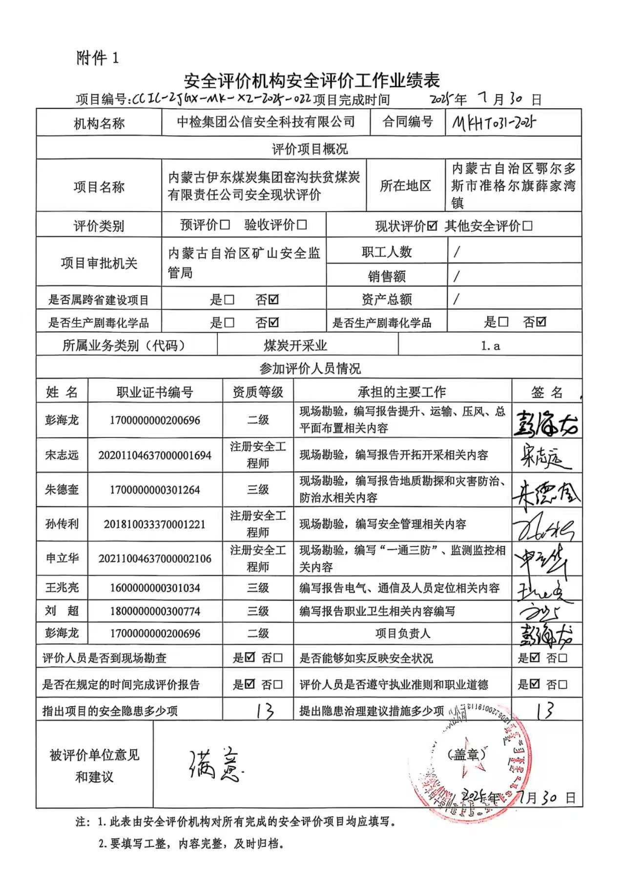 評價(jià)項(xiàng)目名稱 | 內(nèi)蒙古伊東煤炭集團(tuán)窯溝扶貧煤炭有限責(zé)任公司安全現(xiàn)狀評價(jià)報(bào)告 | ||||||