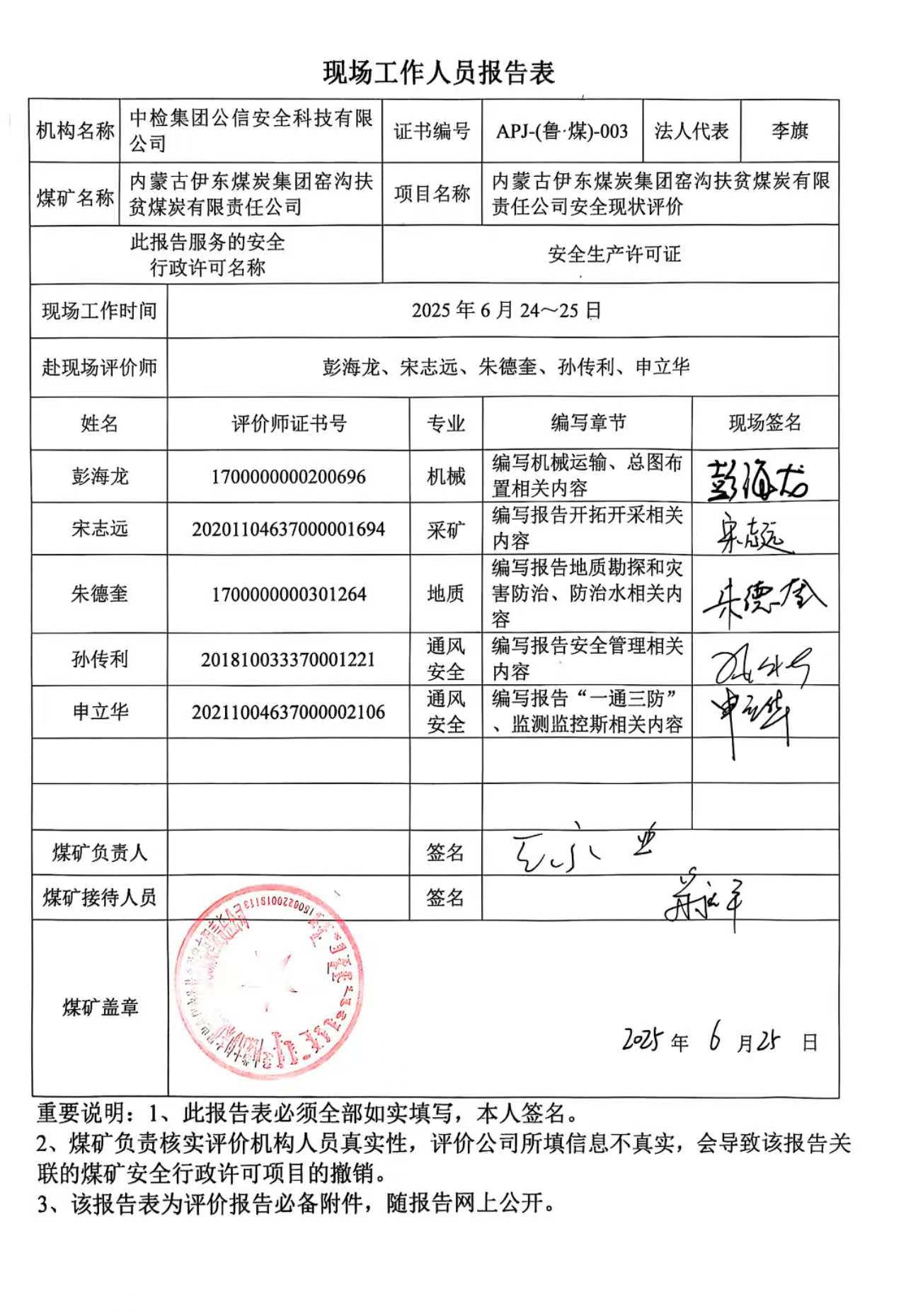 現(xiàn)場開展安全評價(jià)工作的人員、時(shí)間及主要任務(wù): 彭海龍 孫傳利 申立華 朱德奎 宋志遠(yuǎn)于2025年6月24日~25日到現(xiàn)場進(jìn)行調(diào)查、搜集資料,進(jìn)行現(xiàn)場評價(jià)。 彭海龍 申立華 朱德奎于2025年6月15~27日對現(xiàn)場問題進(jìn)行復(fù)查,礦方均已整改合格。 彭海龍 孫傳利 申立華 朱德奎 宋志遠(yuǎn) 王兆亮 劉超 對報(bào)告進(jìn)行了編寫。 | |||||||